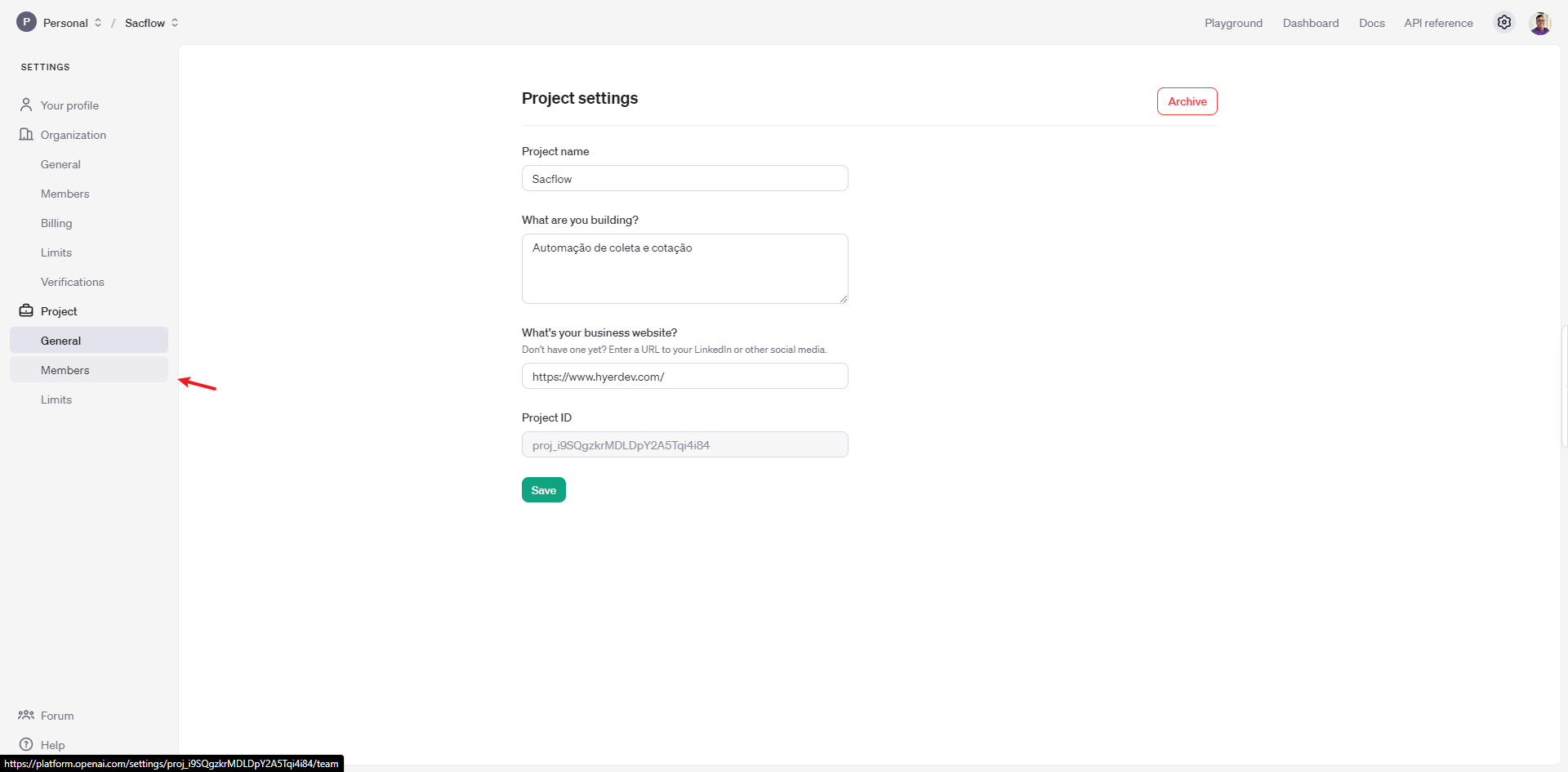 • Nomeie o projeto como "Sacflow" e preencha os dados do site e coloque uma descrição.