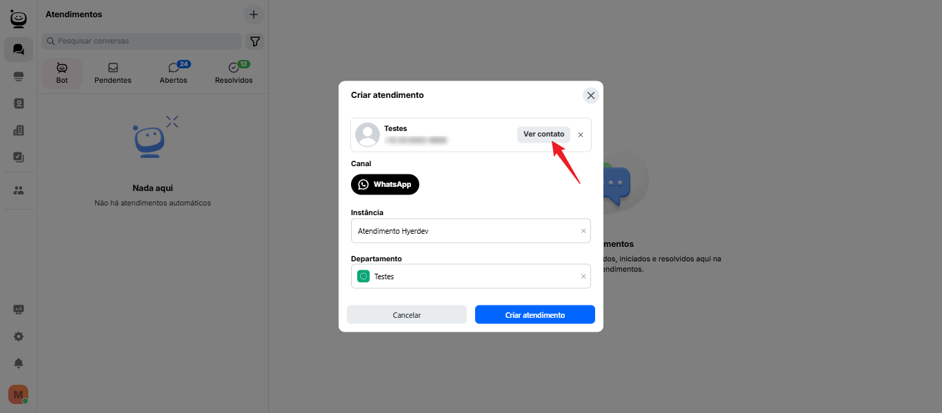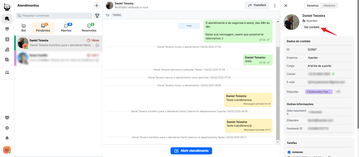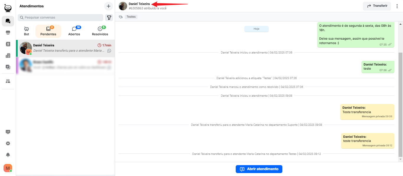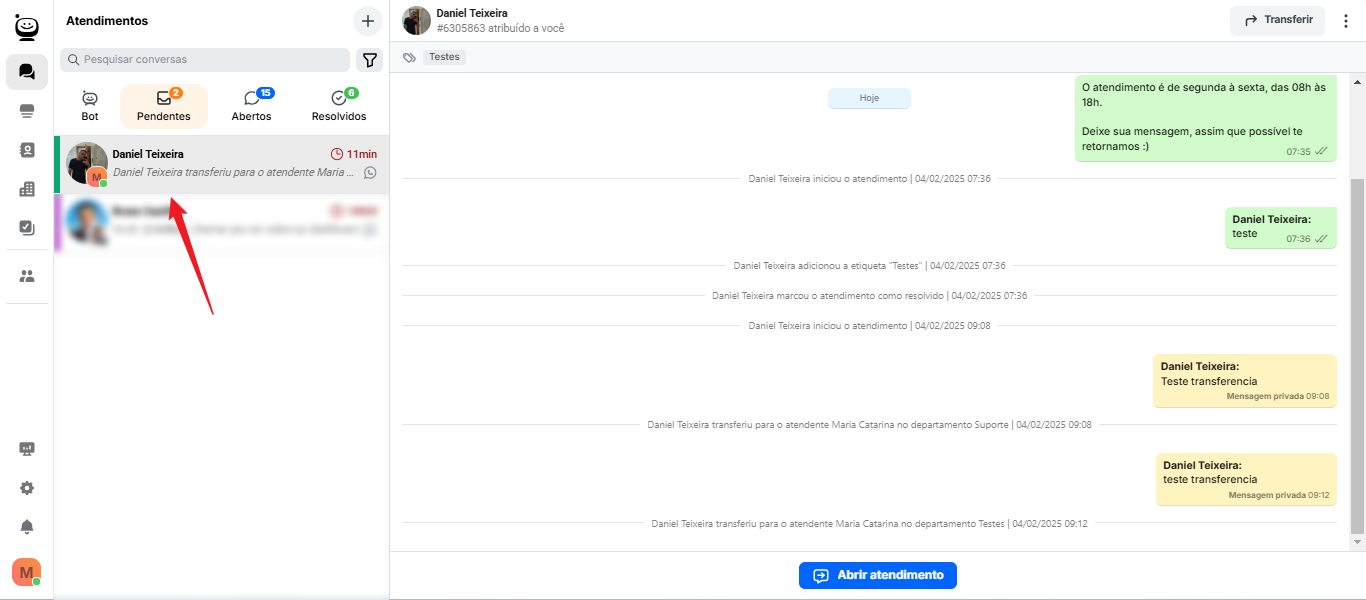 Passo 1: No menu principal do Sacflow, acesse o atendimento referente ao contato que deseja bloquear