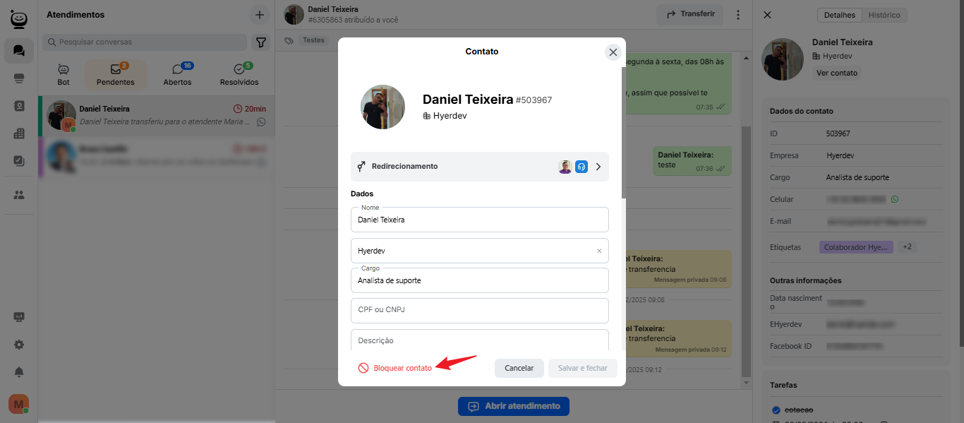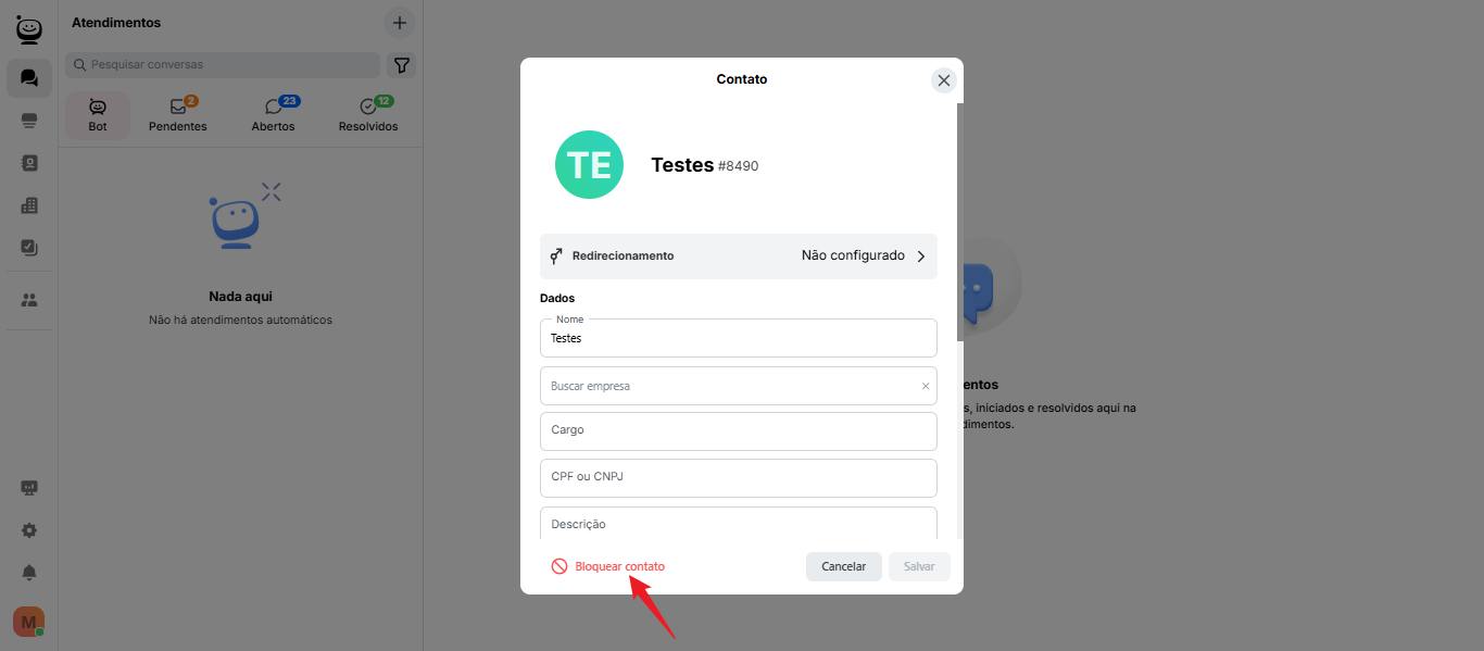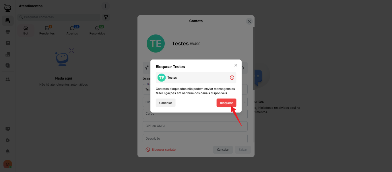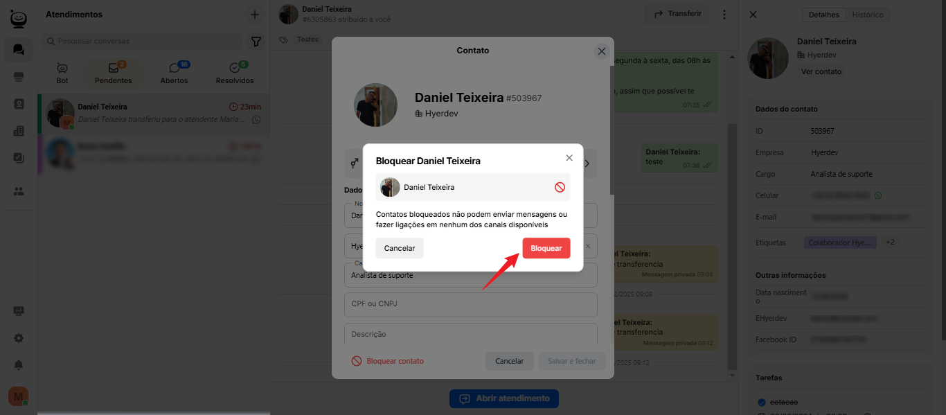 Após o bloqueio, o contato não poderá mais entrar em contato com nenhum departamento da empresa. Isso ajuda a evitar interações indesejadas ou situações recorrentes.