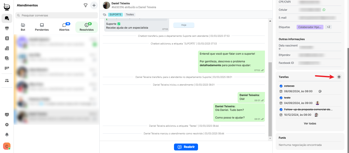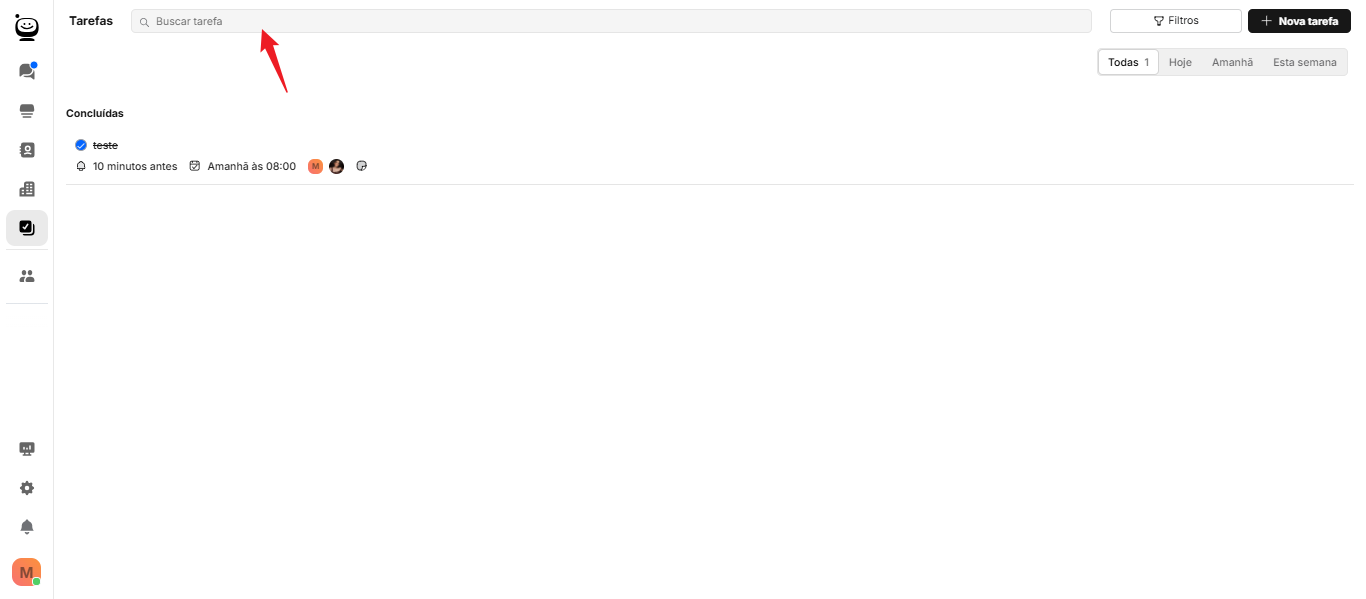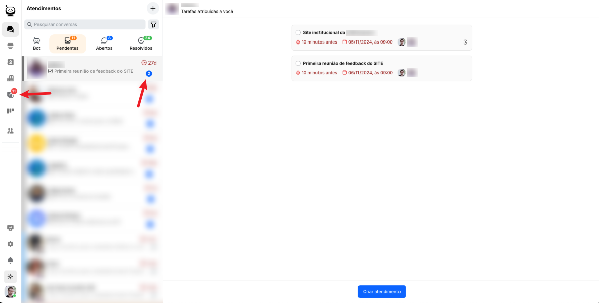 Tarefas atrasadas aparecem como pseudo-atendimentos pendentes para lembrar e motivar a pessoa a concluí-las. Além disso, elas ficam registradas em vermelho em cima do ícone de tarefas, facilitando a visualização das pendências.