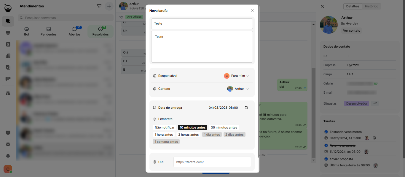 No Sacflow, você também pode criar tarefas diretamente a partir de um atendimento em andamento, garantindo melhor organização e acompanhamento das interações com seus clientes