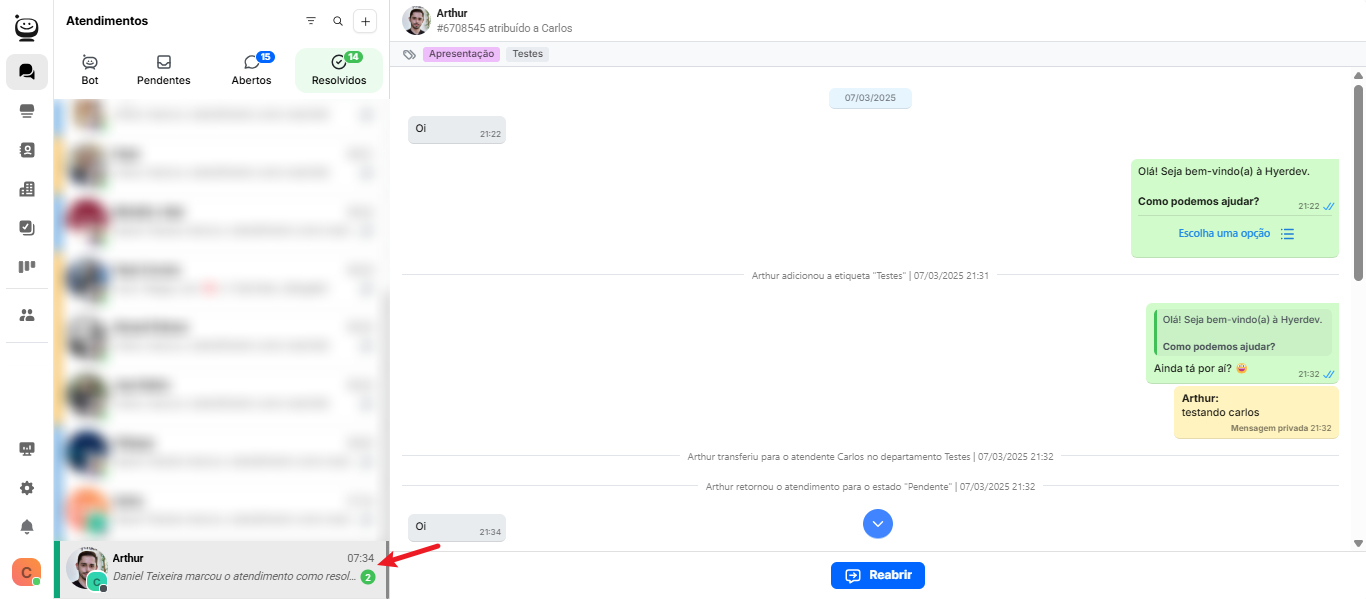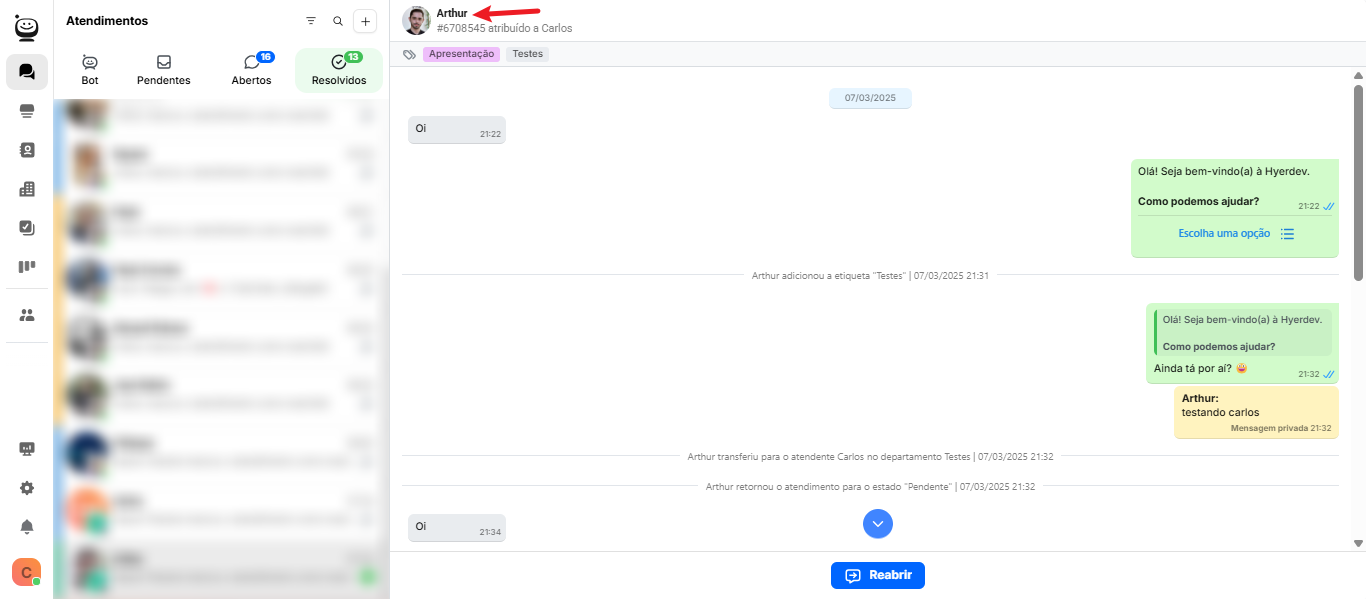 Passo 1: Acesse a aba Atendimentos e selecione a conversa desejada
