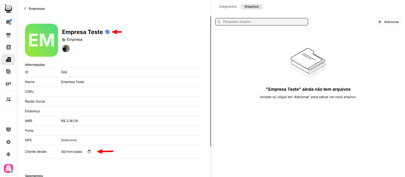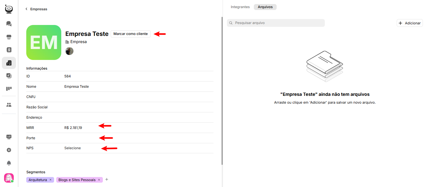 Passo 3: Clique na empresa para abrir o menu. Nesta tela, é possível preencher o MRR, NPS, Porte, Cliente desde e marcar como cliente