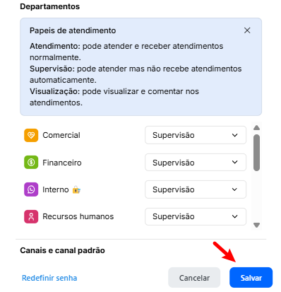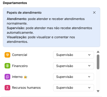 Passo 4: Na aba de Departamentos, selecione o papel adequado para o usuário em cada departamento em que ele está alocado