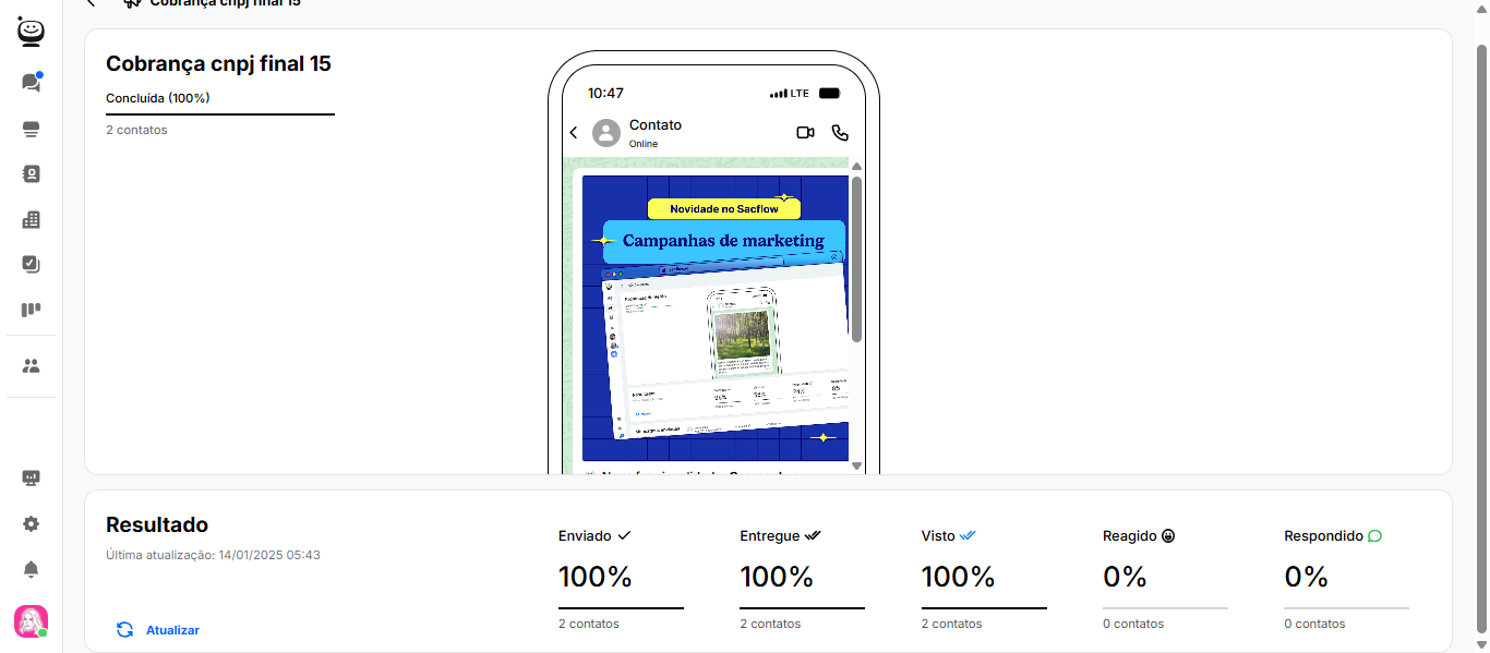 Com essa funcionalidade, você pode automatizar o envio de mensagens personalizadas, direcionadas a uma lista segmentada de contatos, tornando suas interações escaláveis. Ideal para promoções, atualizações e follow-ups, as campanhas ajudam a manter o cliente engajado de forma estratégica e sem sobrecarregar a equipe.