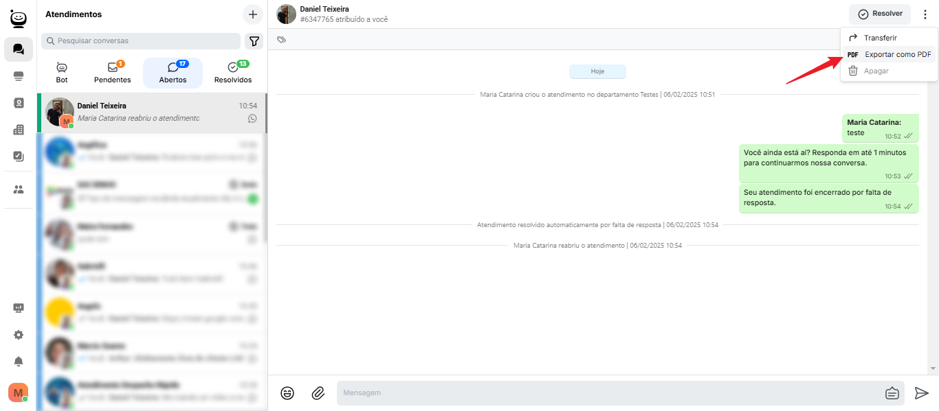 Com essa opção, você pode compartilhar todas as interações com seus clientes de forma prática e organizada. Isso facilita o acompanhamento do atendimento, o armazenamento de informações para futuras consultas e até a entrega de relatórios, tudo de maneira simples e acessível.