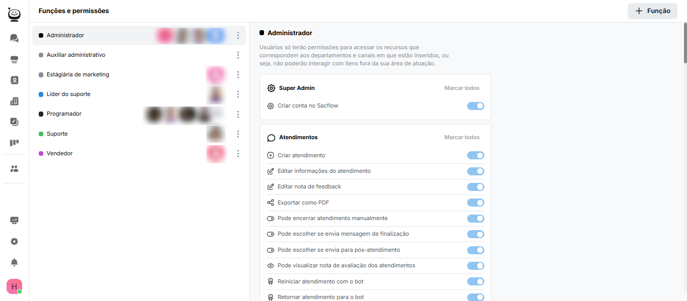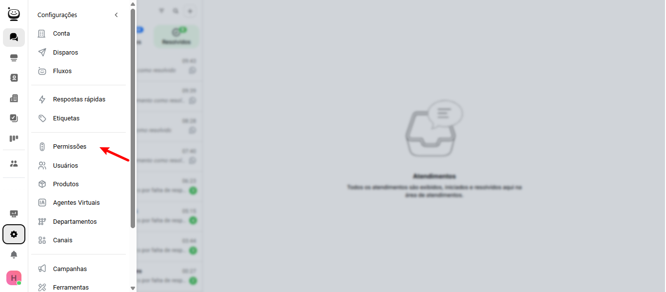A função de encerrar atendimentos manualmente permite que o atendente finalize os tickets de forma controlada, sem depender do tempo estabelecido pelo sistema. Essa permissão é essencial para garantir que o processo de atendimento seja encerrado corretamente e de forma transparente