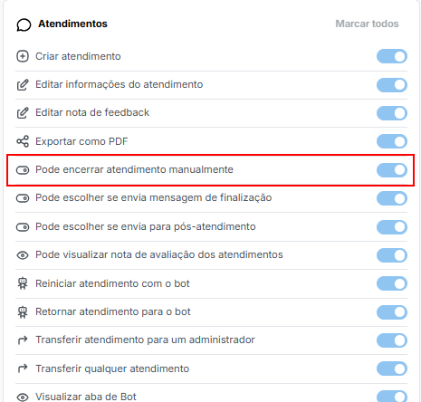 Passo 4: Localize a seção "Atendimentos" e marque a opção "Pode encerrar atendimento manualmente"