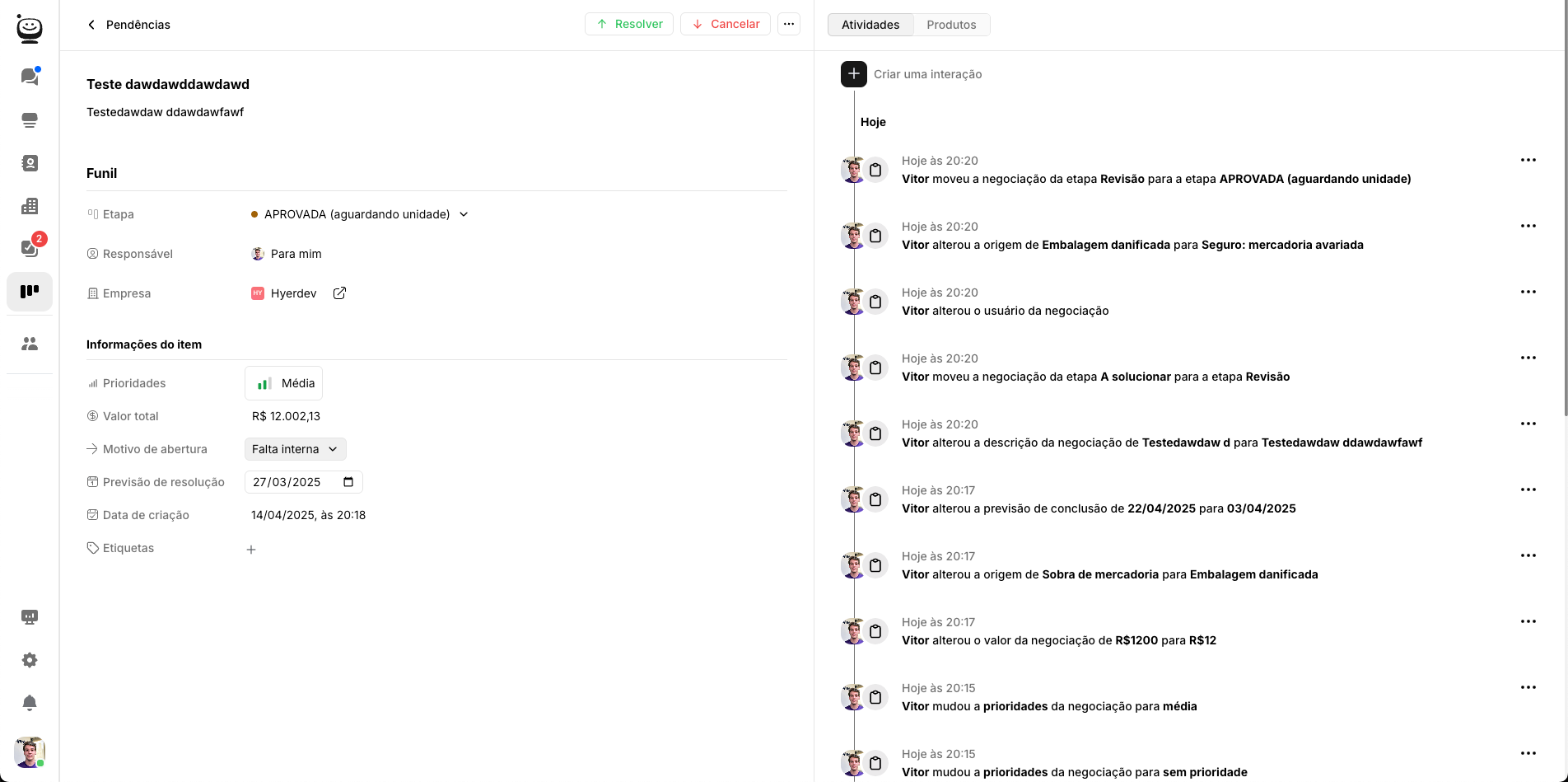 Dica: No lado direito superior da tela, você também consegue visualizar e adicionar as atividades e produtos vinculados àquela oportunidade.