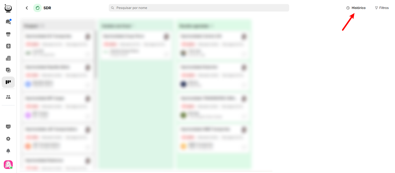 No canto superior direito da tela do funil, você encontra duas ferramentas importantes: Histórico e Filtros.
