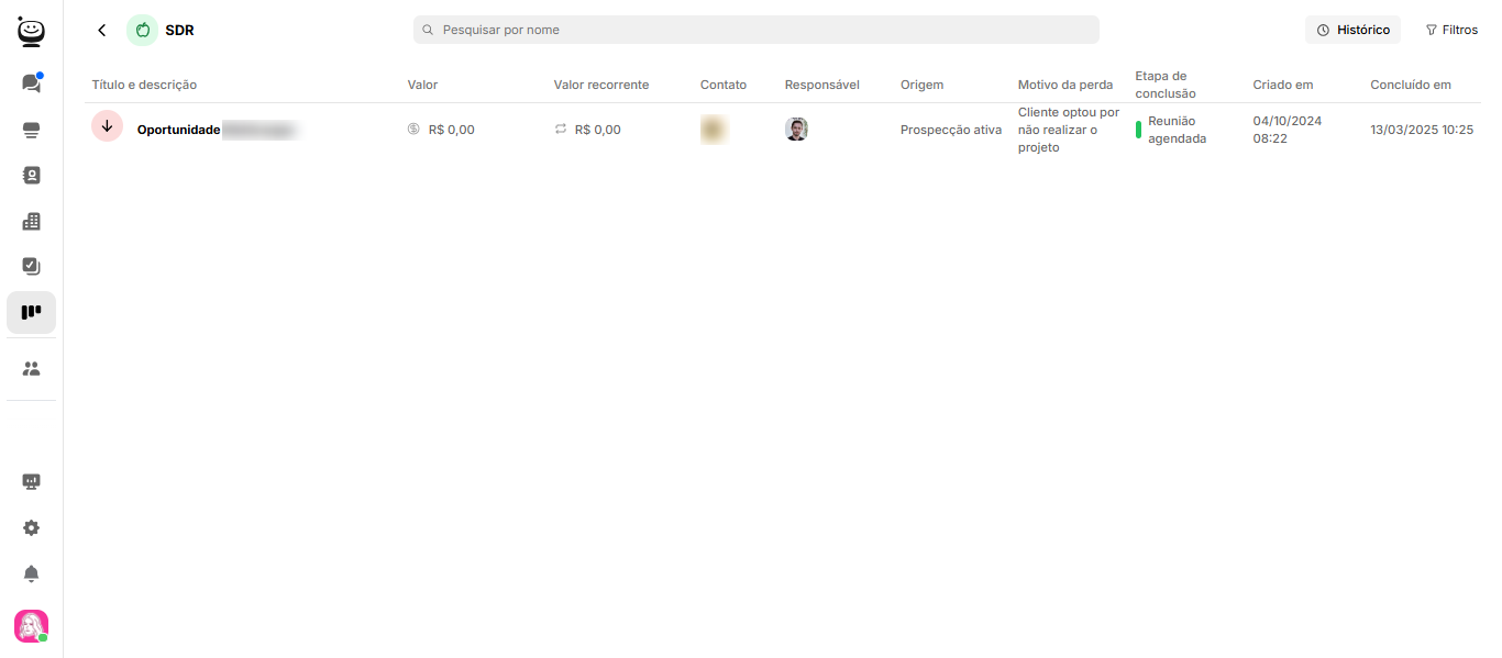 Ao clicar em Histórico, você poderá visualizar todas as oportunidades que foram perdidas ou concluídas, com detalhes sobre o que ocorreu em cada caso. Essa visualização ajuda a entender o que deu certo ou o que pode ser ajustado nas próximas abordagens.