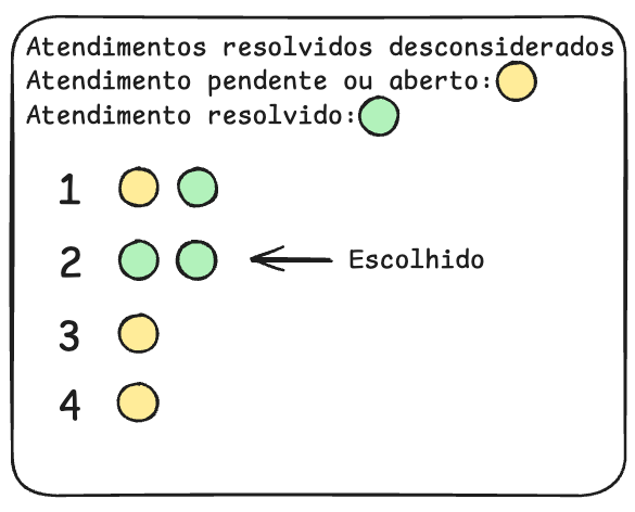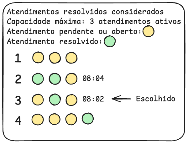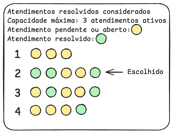 Usuário 2 foi escolhido pois no departamento estava ativada a configuração de considerar atendimentos resolvidos na contagem de atendimentos e a capacidade máxima de atendimentos simultâneos (pendentes ou abertos) estava configurado para 3, logo, os usuários 1, 3 e 4 foram desconsiderados pois tinham 3 ou mais atendimentos simultâneos, o usuário 2 foi escolhido pois tinha somente 2 atendimentos simultâneos, mesmo tendo mais atendimentos totais que os demais usuários.