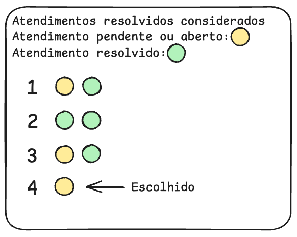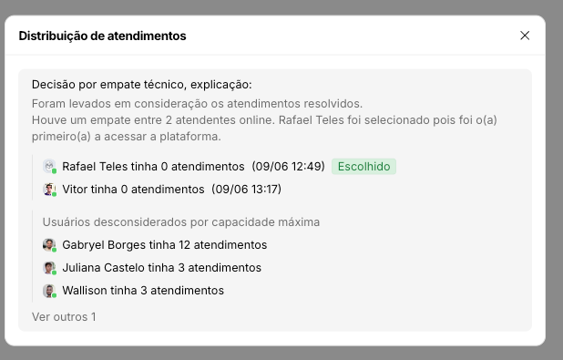 • Em caso de empate, o critério de desempate será o tempo de ociosidade: prioriza-se o usuário que estiver há mais tempo sem receber atendimento via distribuição automática. Se um usuário nunca tiver sido atendido automaticamente, considera-se o intervalo decorrido desde a data de sua criação.