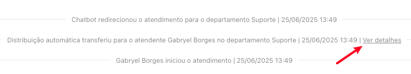 Quando a transferência automática escolhe um usuário, a explicação da escolha fica disponível em um log no atendimento clicando em “Ver detalhes”