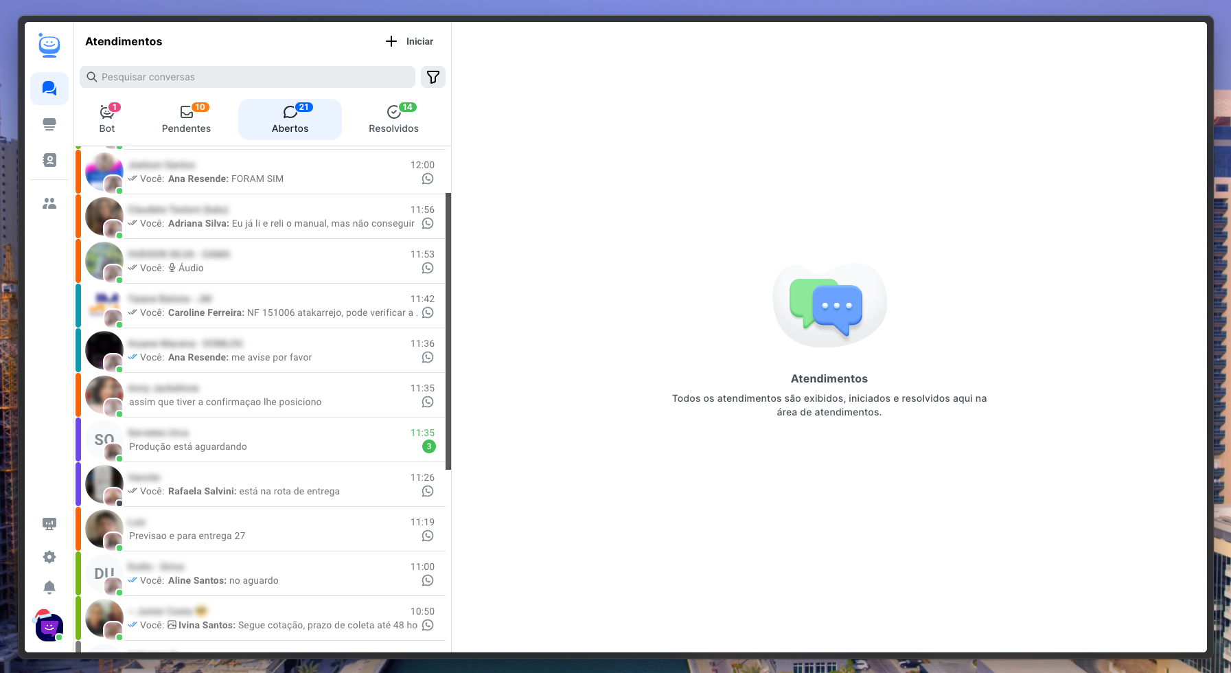 Esta é a principal tela, onde os atendentes atuam para realizar o atendimento dos clientes. Nela temos 4 abas para separar as etapas de cada atendimento em Bot, Pendentes, Abertos e Resolvidos.